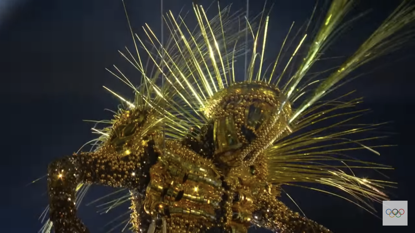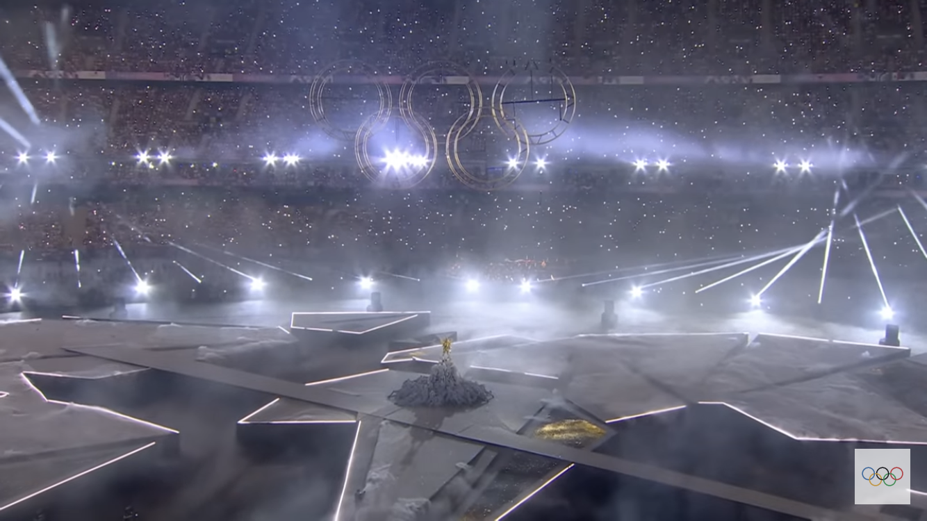 The golden voyager, I argue, is the owner of a third pair of these angel wings illuminated in the opening ceremony. In the closing ceremonies, he comes down from the heavens, and a minion of helpers who assist his reconstruction of the Olympic rings descend from heaven as well (Maybe like the angels that fell with Satan in Revelation 12). The stage is the world, and the world is covered with smoke (Maybe like the smoke released from the bottomless pit opened by the fallen star in Revelation 9:2). They lift him up at the end as he sparkles with physical beams radiating from him. The lines of the gold coming off of him look like they make the same arch of the lines in the angel wings of the opening ceremonies. Similarly, the lines are sharp like rays, and they are pretty much the same color. His head looks like a skull with a crown and antenna. He kind of looks like a glorified skeleton to me. I argue that a third pair of wings can be connected with this golden voyager figure.