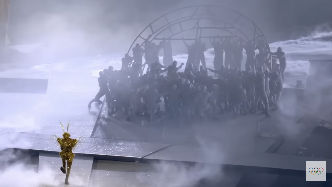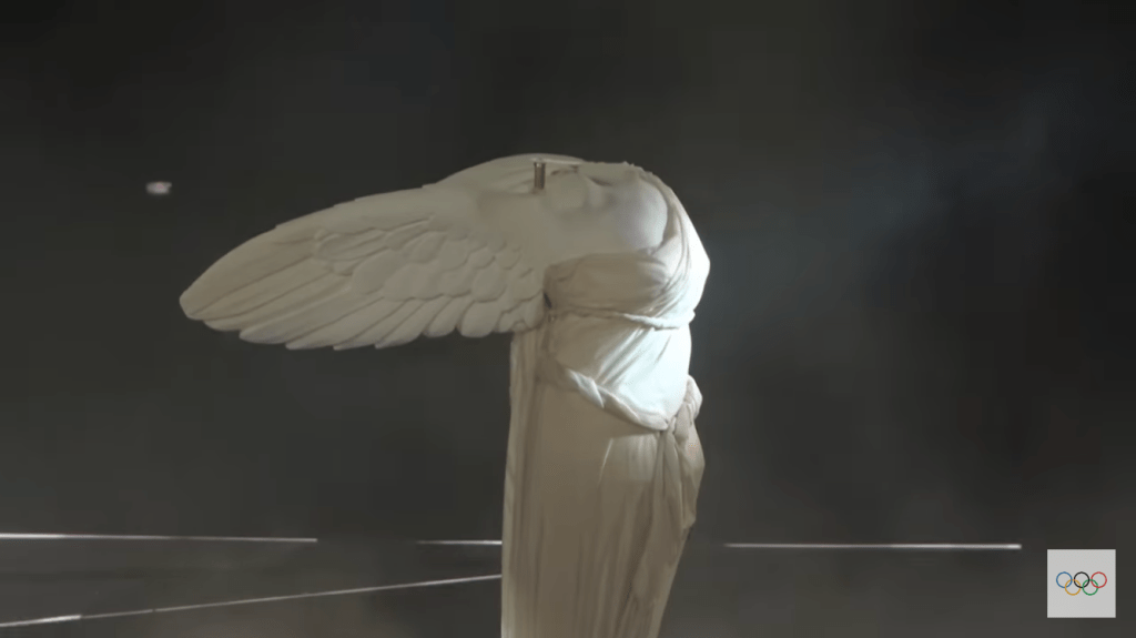 During the closing ceremony’s show, the beheaded statue of Nike rises out of stage floor. Nike has divine wings. She is the goddess of victory, and the icon of the final conflict between Christianity and paganism during the Roman empire. In the closing show, she is “resurrected” as if reversing the Christianization of the Roman empire.